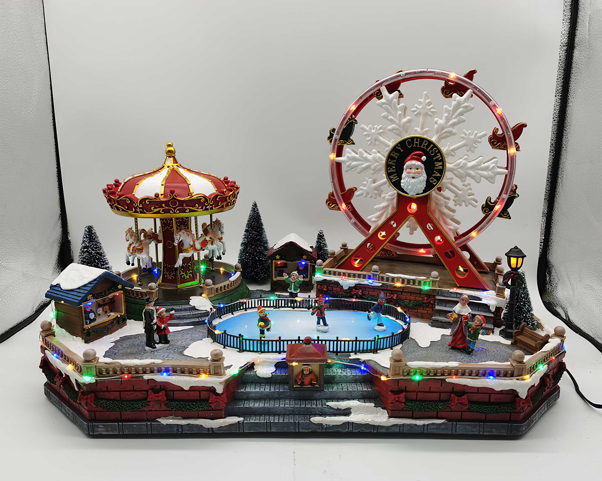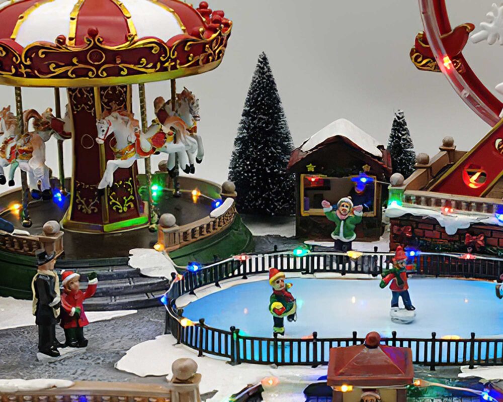 Grande villaggio natalizio con Luna Park ricco di dettagli e personaggi che popolano lo spazio. Illuminato con luci led colorate, questo villaggetto natalizio riproduce 8 canzoni di Natale e compie 3 diversi movimenti: i bambini si muovono pattinando sul ghiaccio, la giostra e la ruota panoramica funzionano realmente.