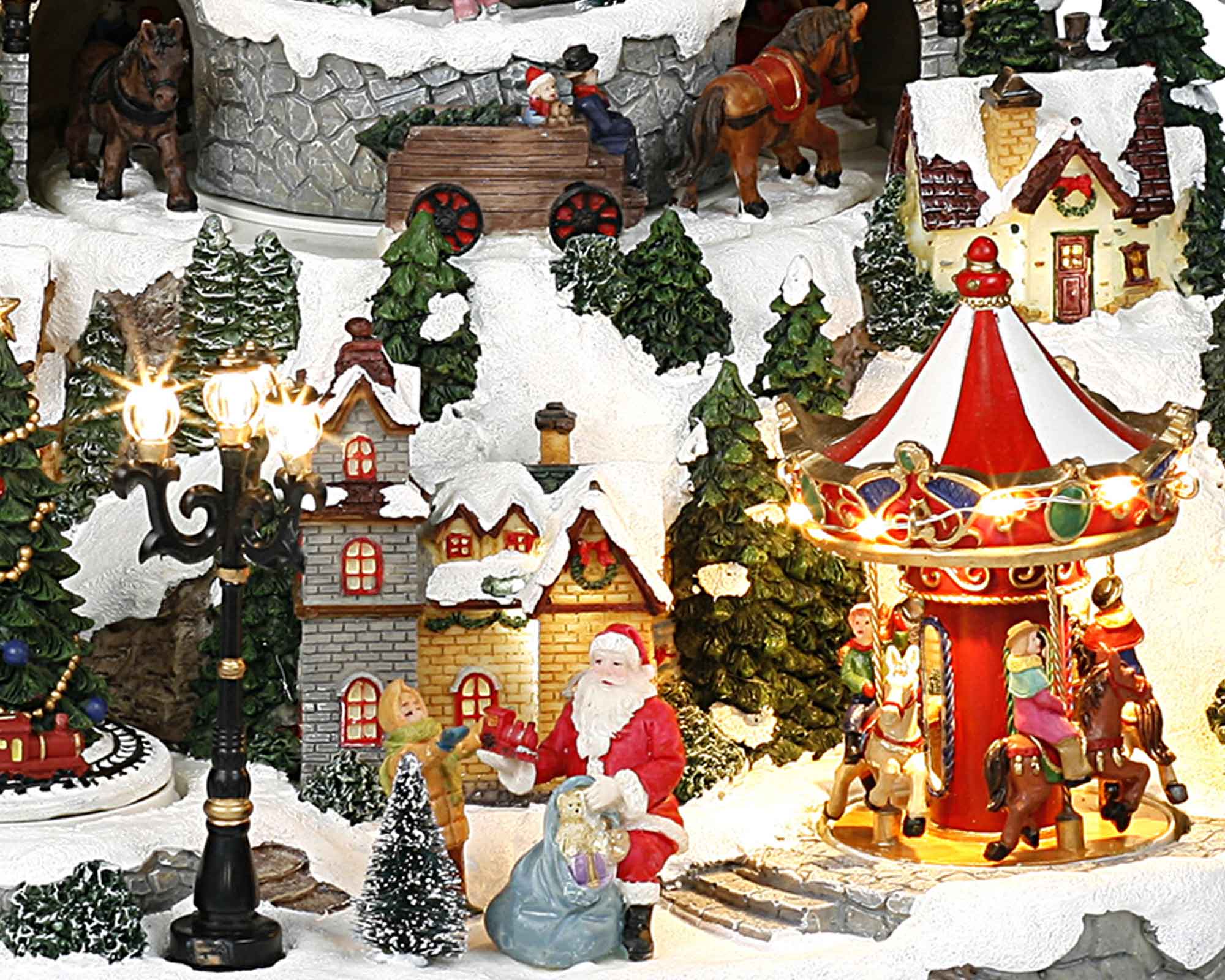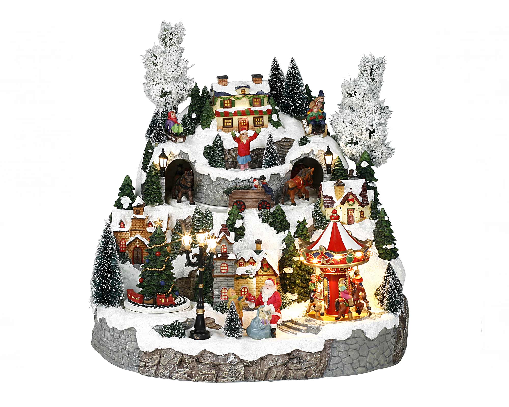 Villaggio natalizio innevato in movimento con giostre, carroo con cavallo e led