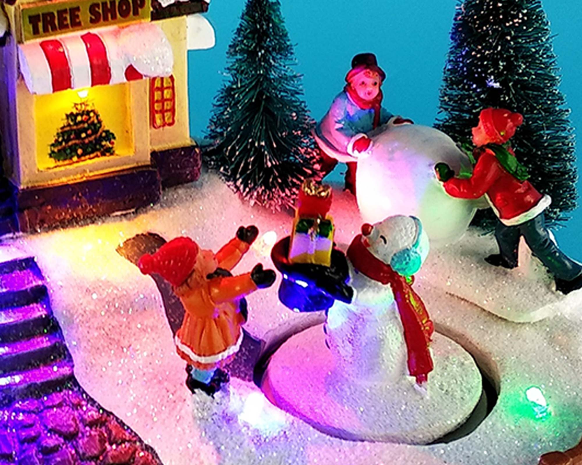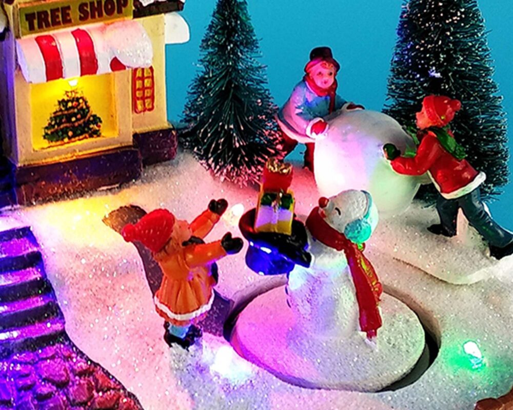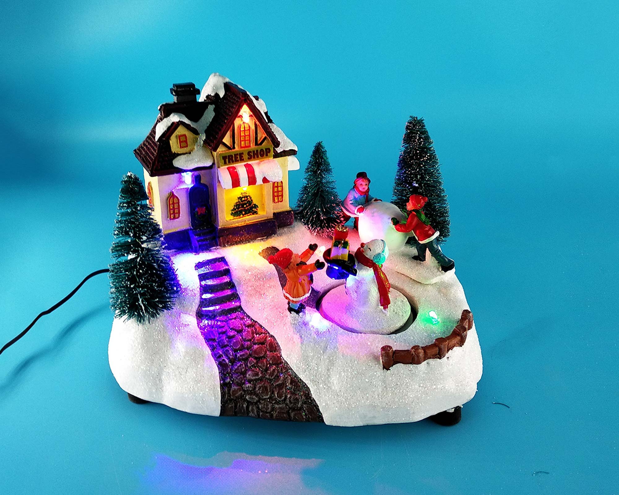 Villaggio natalizio innevato in movimento con pupazzo di neve, musica e led