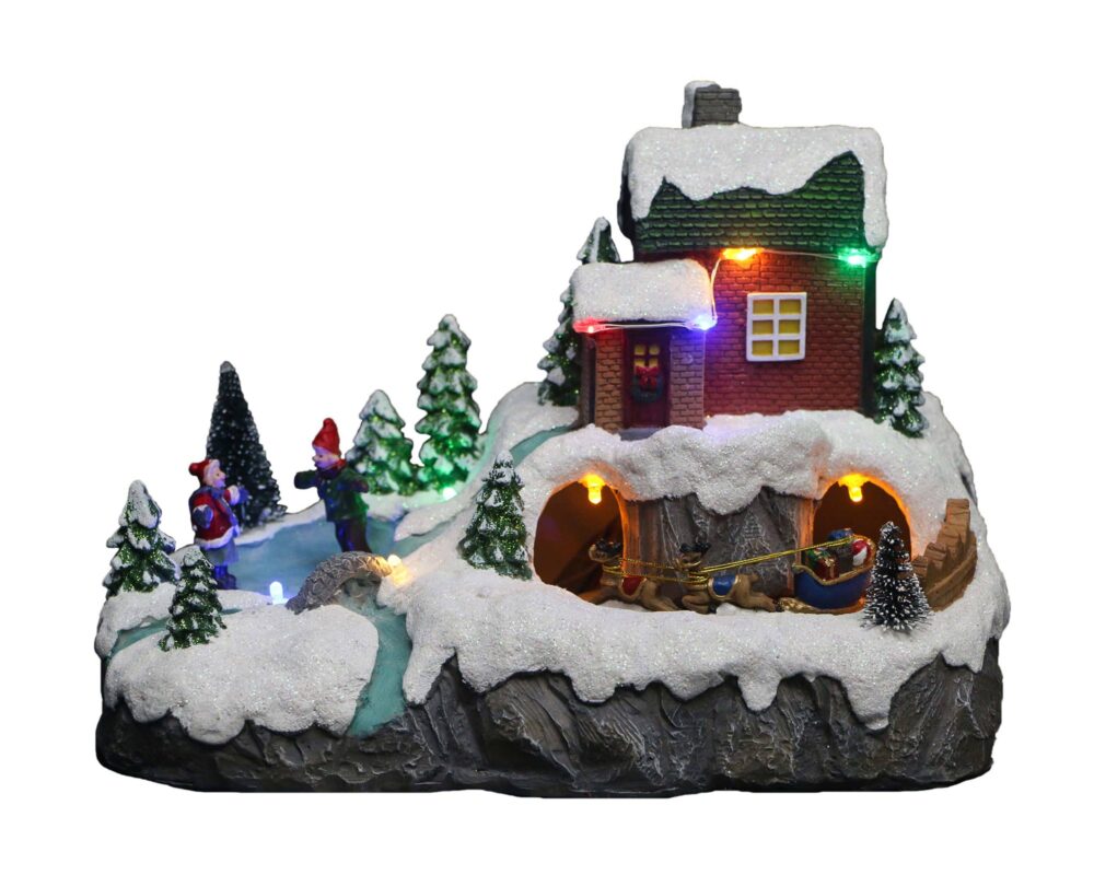 Villaggio nordico in movimento con slitta di Babbo natale, pattinatori, musica e led