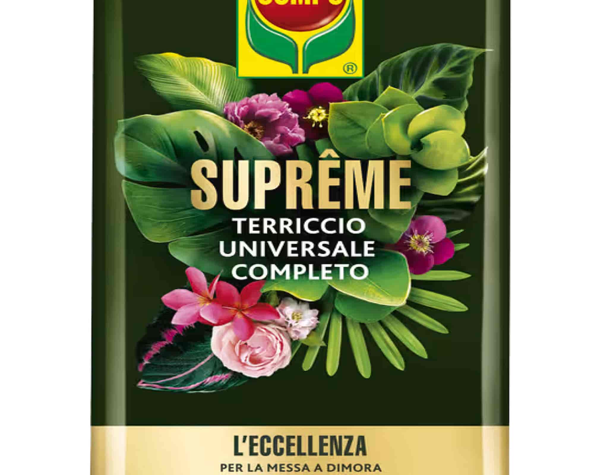 COMPO SUPREME Terriccio Universale, un substrato di alta qualità pronto all’uso, sviluppato appositamente per piantare e trapiantare piante in appartamento, su balconi, terrazzi e in giardino. Composto per circa il 90% da torba certificata selezionata, garantisce struttura, leggerezza e un ambiente ideale per le radici, assicurando alle piante le migliori condizioni per crescere sane e rigogliose.