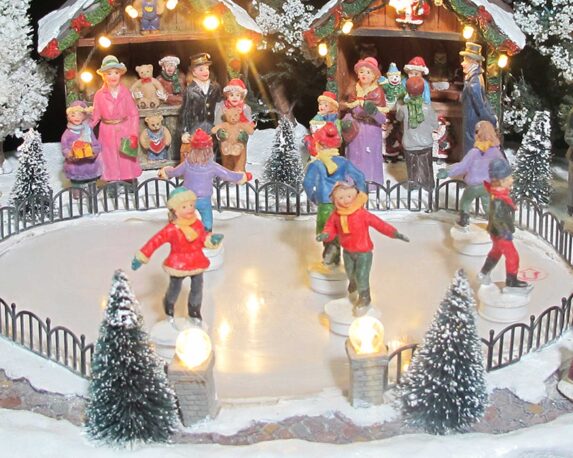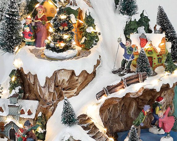 Villaggio di Natale innevato in movimento con pattinatori e led