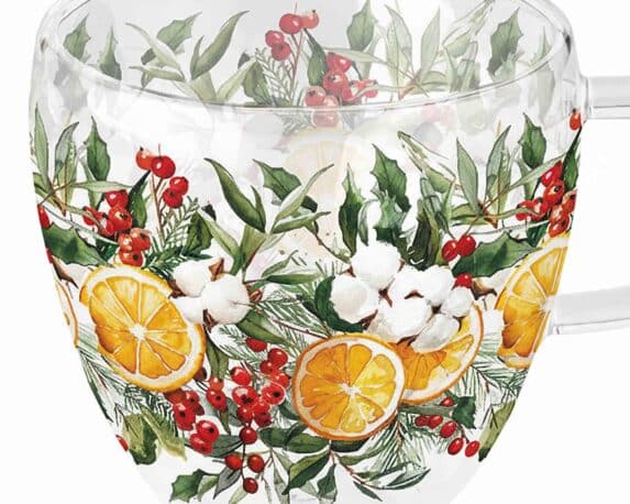 Tazza Natalizia Doppia Parete con Agrifoglio e Arance da 200ml in Vetro